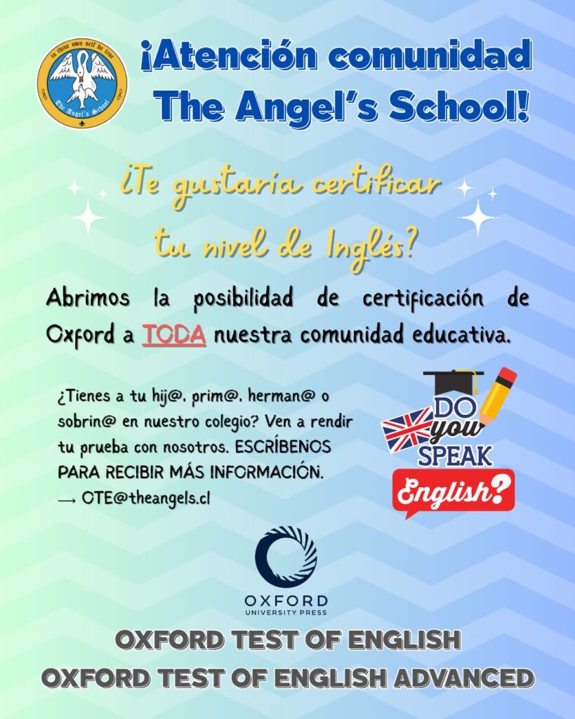 Tenemos el agrado de informarles que se abrirá la posibilidad de certificar el nivel de inglés a toda nuestra comunidad. Hace más de dos años que estudiantes de IV° medio han podido certificarse, y nos alegra mucho ahora entregarles la misma oportunidad a sus familias y conocidos/as. 🇬🇧💻